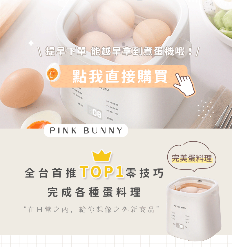 12分鐘前Pink Bunny智能煮蛋機智能控溫烹煮,營養美味輕鬆上桌 - Pink Bunny智能煮蛋機1入組 NT$1090
